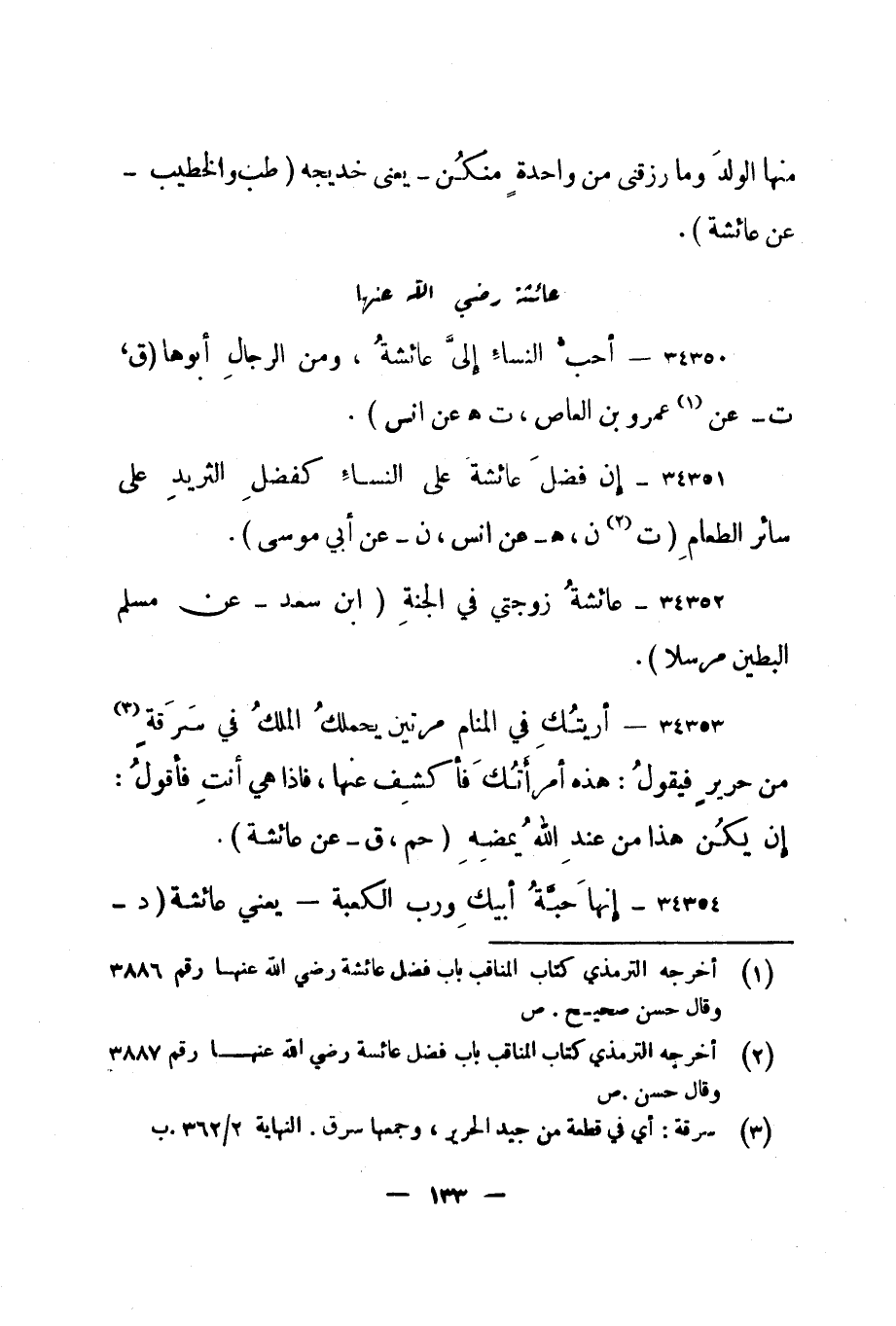 34350- "أحب النساء إلي عائشة، ومن الرجال أبوها. " ق، ت - عن 1 عمرو بن العاص، ت هـ عن أنس".