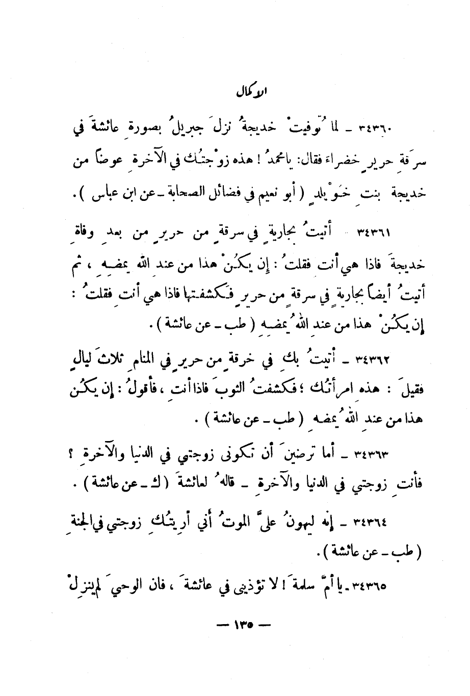 34360- "لما توفيت خديجة نزل جبريل بصورة عائشة في سرقة حرير خضراء فقال: يا محمد! هذه زوجتك في الآخرة عوضا من خديجة بنت خويلد. " أبو نعيم في فضائل الصحابة - عن ابن عباس".