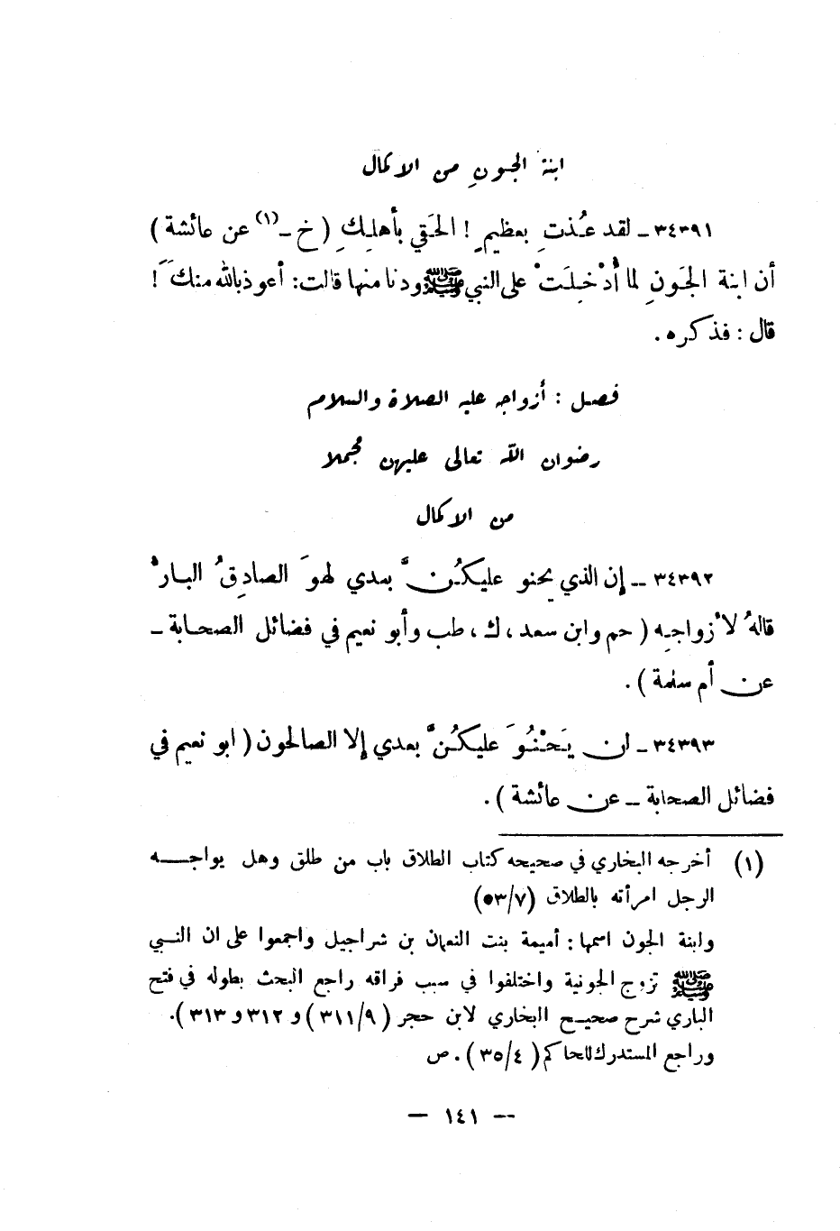 34391- "لقد عذت بعظيم! الحقي بأهلك." خ - 1 عن عائشة" أن ابنة الجون لما أدخلت على النبي صلى الله عليه وسلم ودنا منها قالت: أعوذ بالله منك! قال: فذكره.