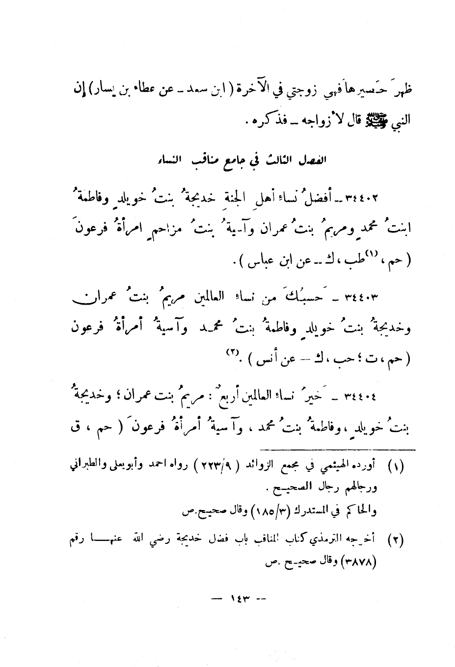 34404- "خير نساء العالمين أربع: مريم بنت عمران؛ وخديجة بنت خويلد، وفاطمة بنت محمد، وآسية امرأة فرعون. " حم، ق