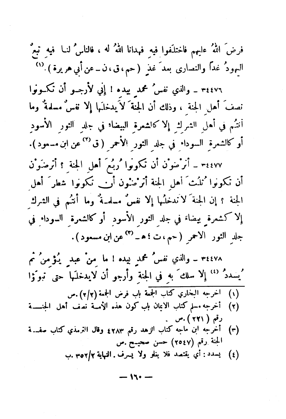 34476- "والذي نفس محمد بيده! إني لأرجو أن تكونوا نصف أهل الجنة، وذلك أن الجنة لا يدخلها إلا نفس مسلمة وما أنتم في أهل الشرك إلا كالشعرة البيضاء في جلد الثور الأسود أو كالشعرة السوداء في جلد الثور الأحمر." ق 2 عن ابن مسعود".