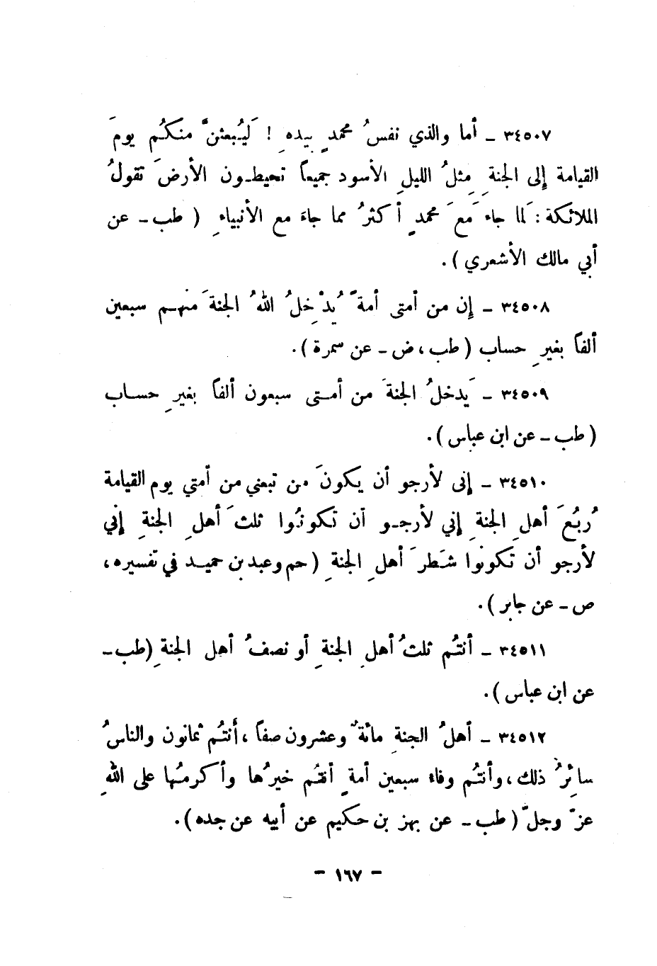 34512- " أهل الجنة مائة وعشرون صفا، أنتم ثمانون والناس سائر ذلك، وأنتم وفاء سبعين أمة أنتم خيرها وأكرمها على الله عز وجل. " طب - عن بهز بن حكيم عن أبيه عن جده".
