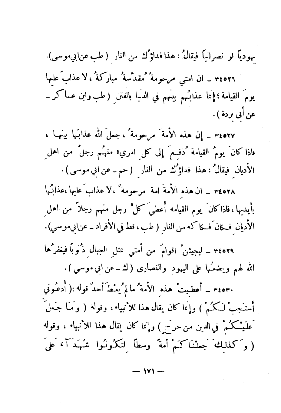 34529- "ليجيئن أقوام من أمتي بمثل الجبال ذنوبا فيغفرها الله لهم ويضعها على اليهود والنصارى." ك - عن أبي موسى".