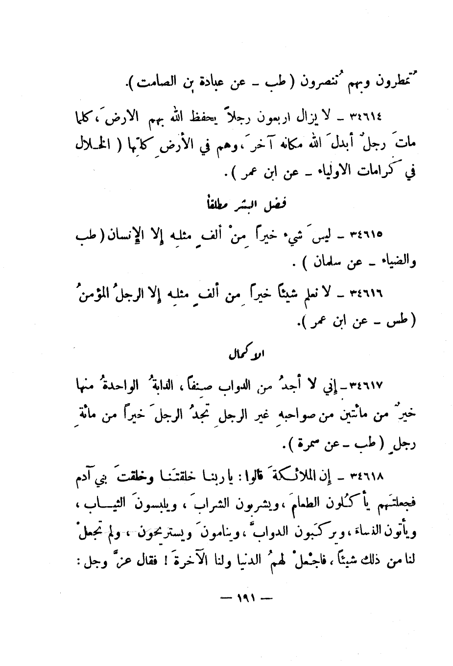 34617- " إني لا أجد من الدواب صنفا، الدابة الواحدة منها خير من مائتين من صواحبه غير الرجل تجد الرجل خيرا من مائة رجل. " طب - عن سمرة".