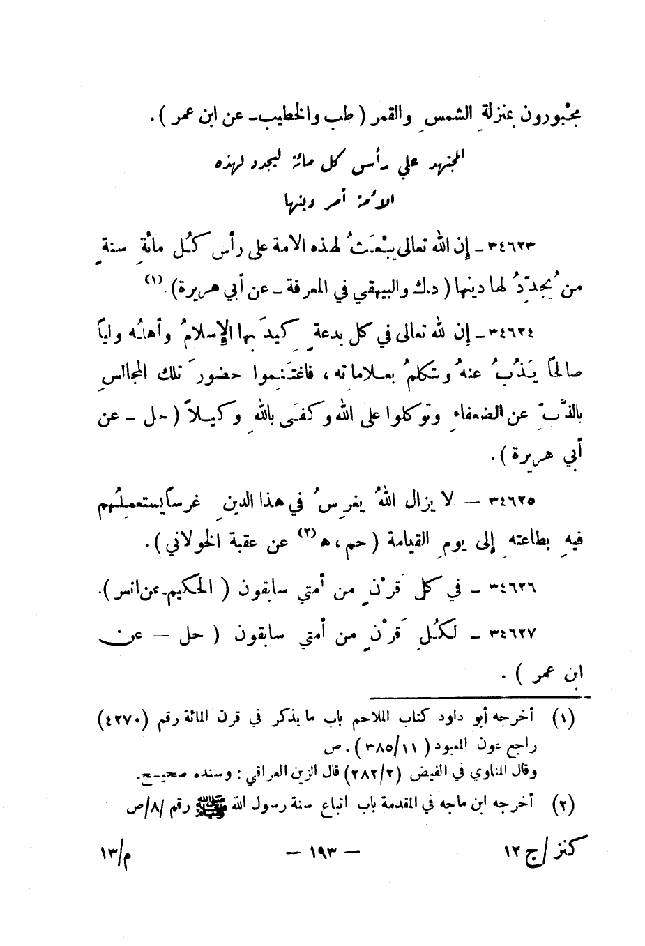 34623- " إن الله تعالى يبعث لهذه الأمة على رأس كل مائة سنة من يجدد لها دينها. " د، ك والبيهقي في المعرفة - عن أبي هريرة". 1
