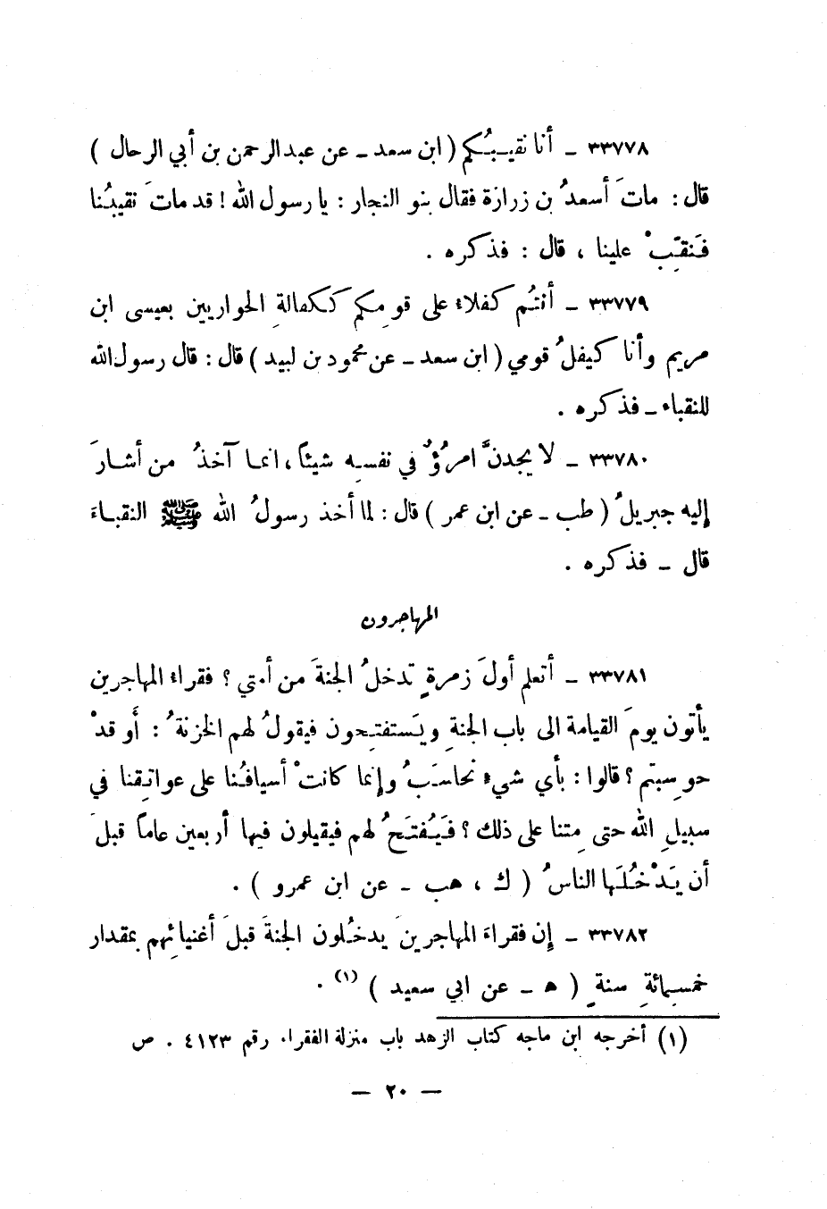 33782- "إن فقراء المهاجرين يدخلون الجنة قبل أغنيائهم بمقدار خمسمائة سنة. " هـ - عن أبي سعيد"1.