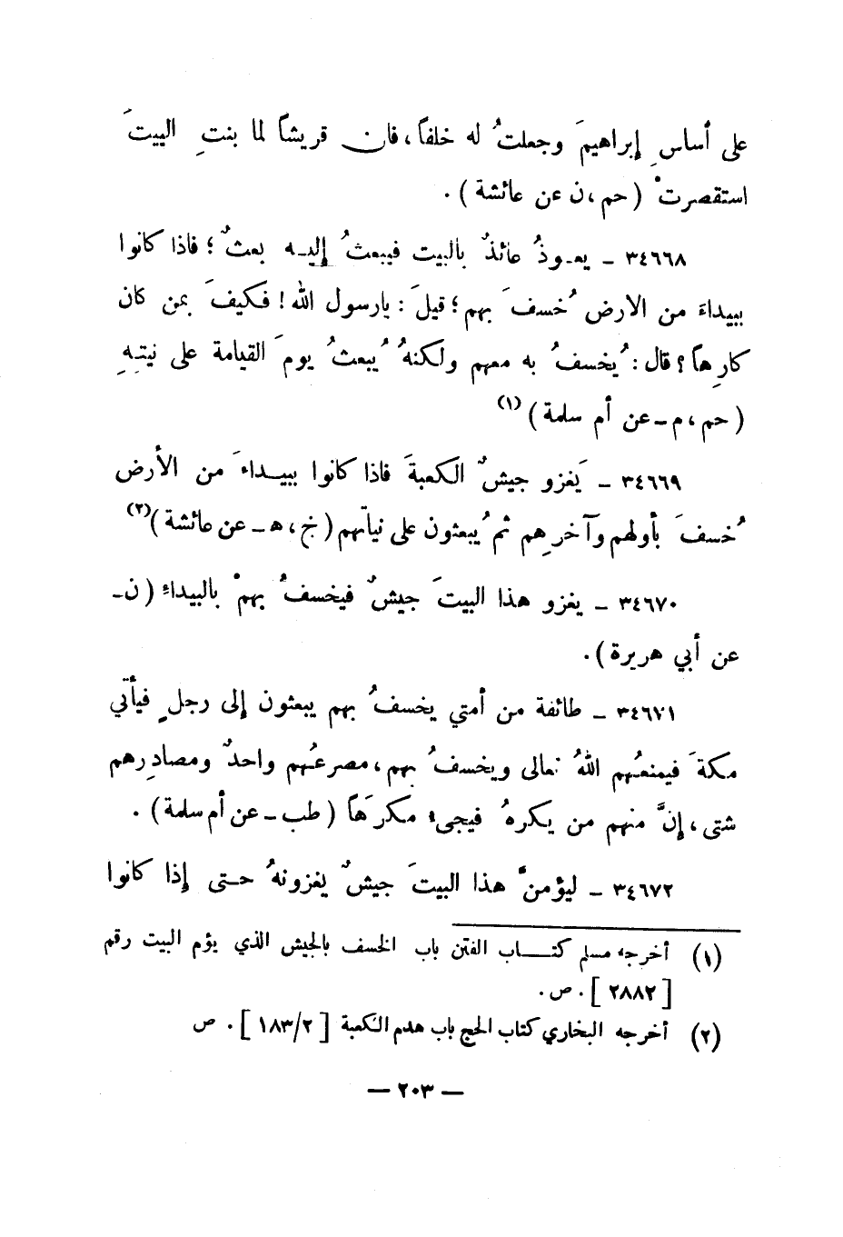34669- "يغزو جيش الكعبة فإذا كانوا ببيداء من الأرض خسف بأولهم وآخرهم ثم يبعثون على نياتهم. " خ، هـ - عن عائشة" 2