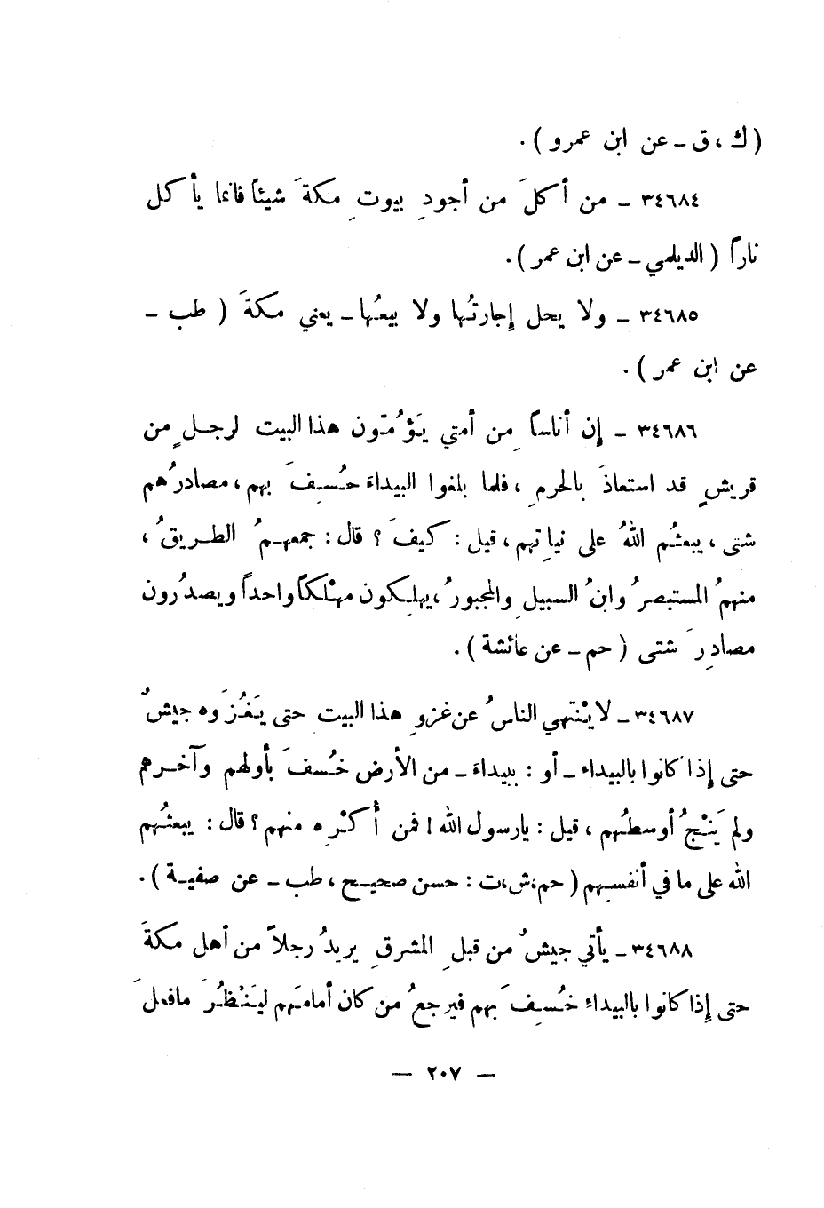 34688- "يأتي جيش من قبل المشرق يريد رجلا من أهل مكة حتى إذا كانوا بالبيداء خسف بهم فيرجع من كان أمامهم لينظر ما فعل