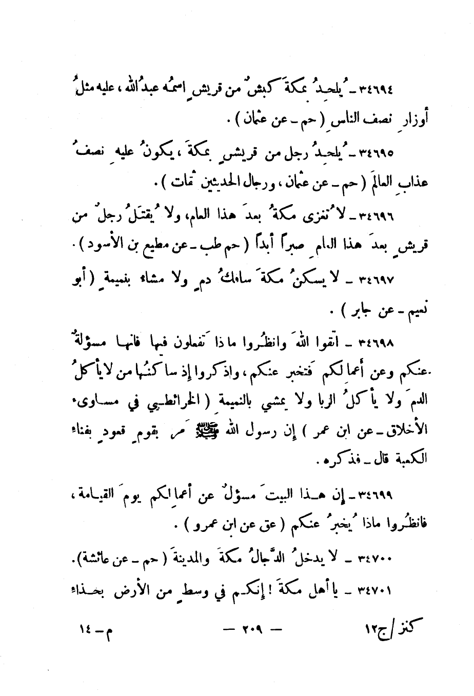 34695- "يلحد رجل من قريش بمكة، يكون عليه نصف عذاب العالم. " حم - عن عثمان، ورجال الحديثين ثقات".