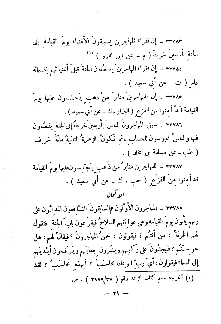 33783- "إن فقراء المهاجرين يسبقون الأغنياء يوم القيامة إلى الجنة بأربعين خريفا. " م - عن ابن عمرو"1.