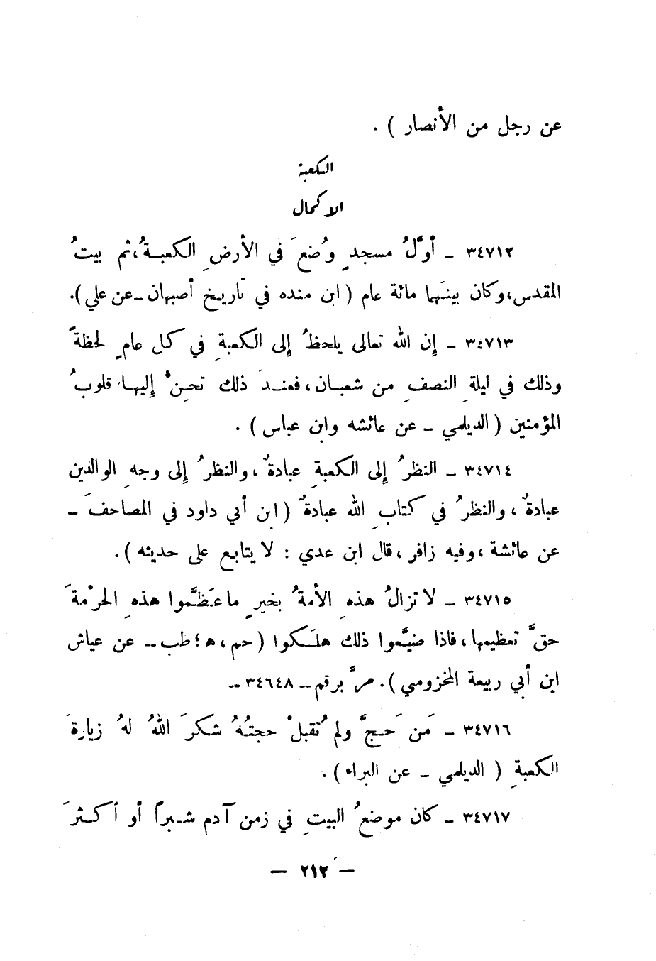 34714- " النظر إلى الكعبة عبادة، والنظر إلى وجه الوالدين عبادة، والنظر في كتاب الله عبادة. " ابن أبي داود في المصاحف - عن عائشة، وفيه زافر، قال ابن عدي: لا يتابع على حديثه".