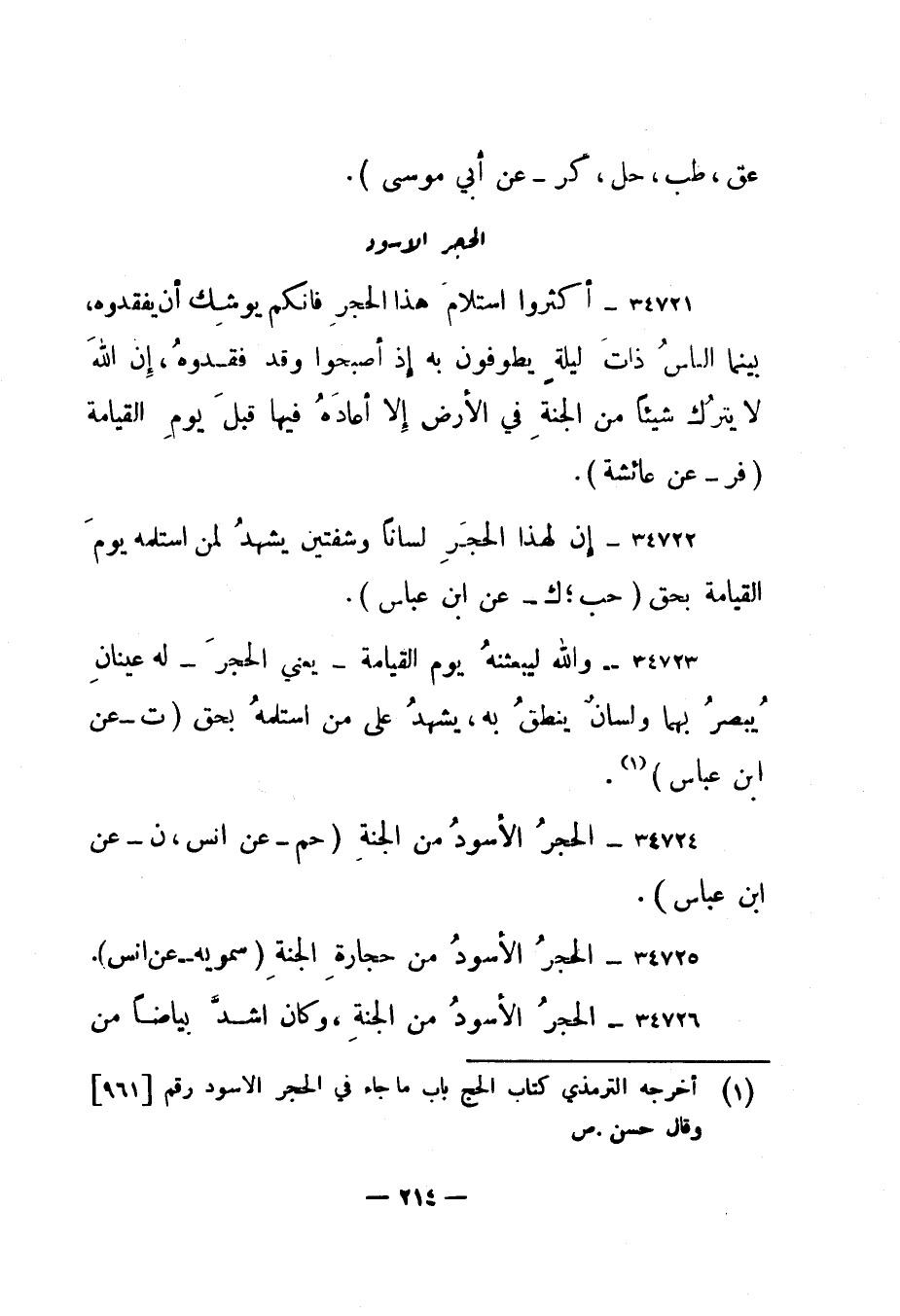 34722- " إن لهذا الحجر لسانا وشفتين يشهد لمن استلمه يوم القيامة بحق. " حب؛ ك - عن ابن عباس".