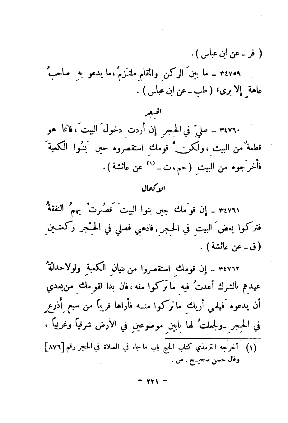 34761- " إن قومك حين بنوا البيت قصر بهم النفقة فتركوا بعض البيت في الحجر، فاذهبي فصلي في الحجر ركعتين. " ق - عن عائشة".
