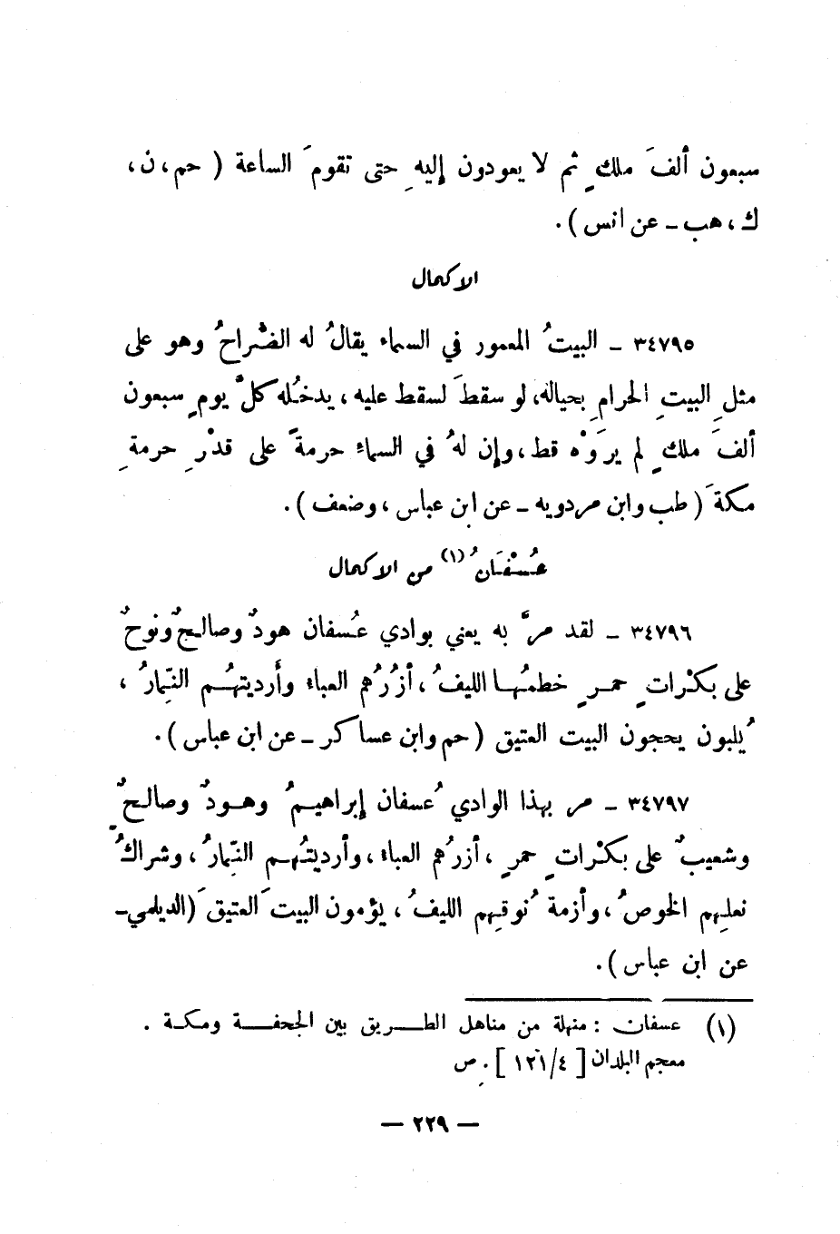 34797- "مر بهذا الوادي عسفان إبراهيم وهود وصالح وشعيب على بكرات حمر، أزرهم العباء، وأرديتهم النمار، وشراك نعلهم الخوص، وأزمة نوقهم الليف، يؤمون البيت العتيق." الديلمي - عن ابن عباس".