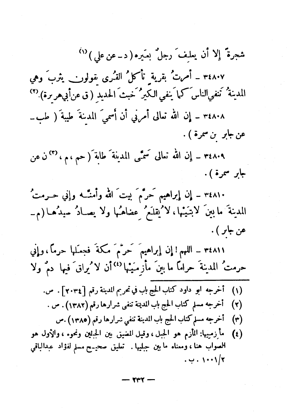 34811- "اللهم! إن إبراهيم حرم مكة فجعلها حرما، وإني حرمت المدينة حراما ما بين مأزميها 4 أن لا يراق فيها دم ولا