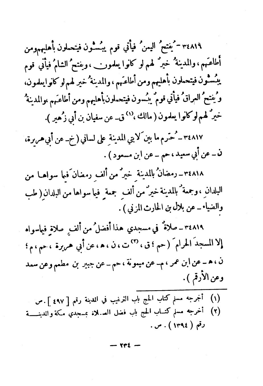 34817- " حرم ما بين لابتي المدينة على لساني. " خ - عن أبي هريرة، ن - عن أبي سعيد، حم - عن ابن مسعود".