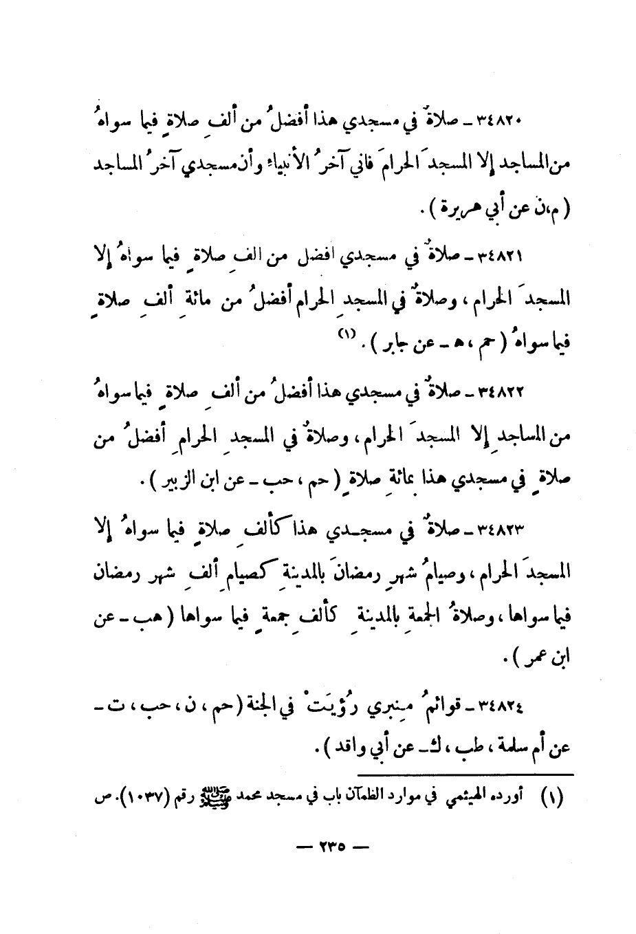 34822- " صلاة في مسجدي هذا أفضل من ألف صلاة فيما سواه من المساجد إلا المسجد الحرام، وصلاة في المسجد الحرام أفضل من صلاة في مسجدي هذا بمائة صلاة. " حم، حب - عن ابن الزبير".