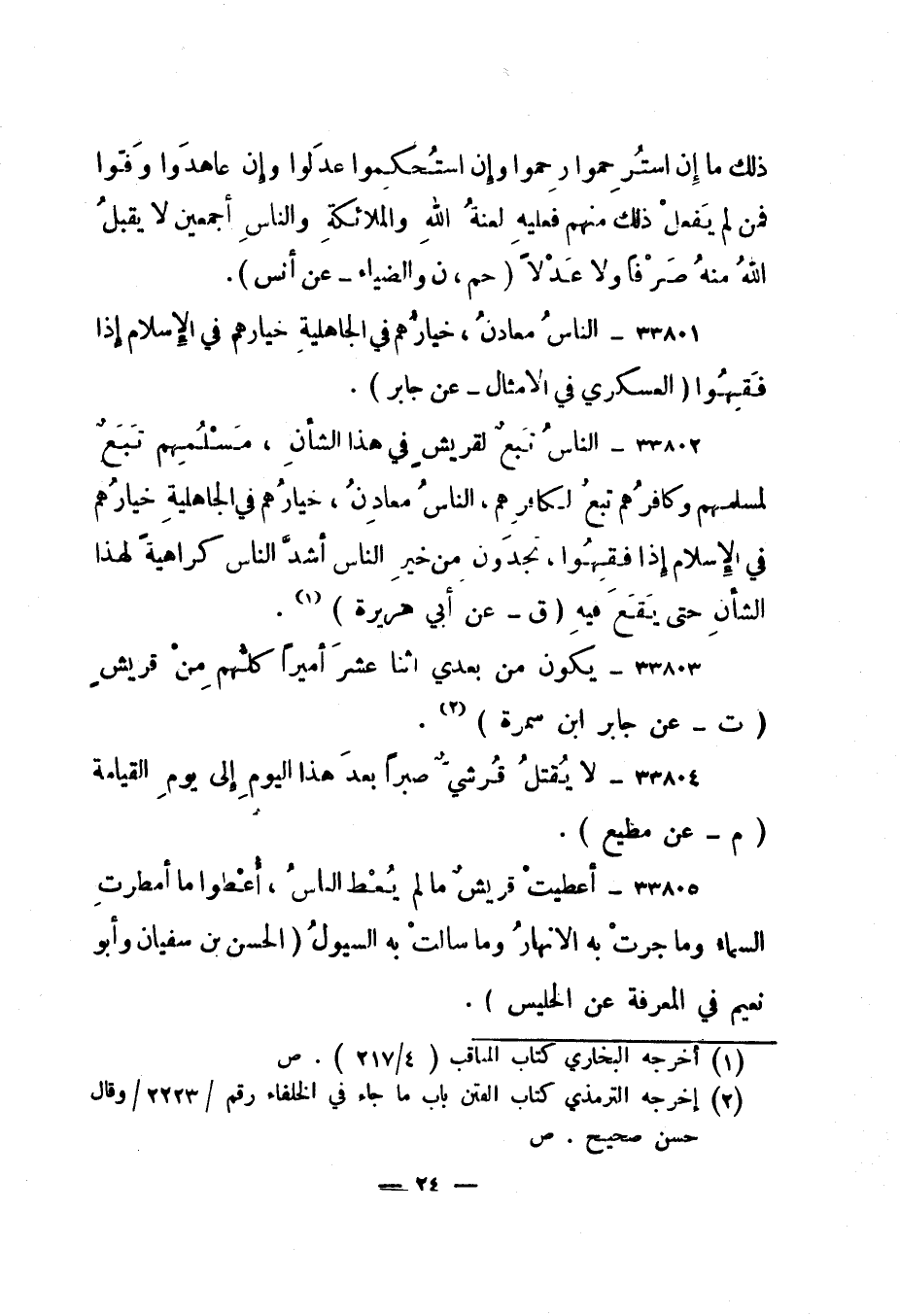 33803- "يكون من بعدي اثنا عشر أميرا كلهم من قريش. " ت - عن جابر ابن سمرة"2.