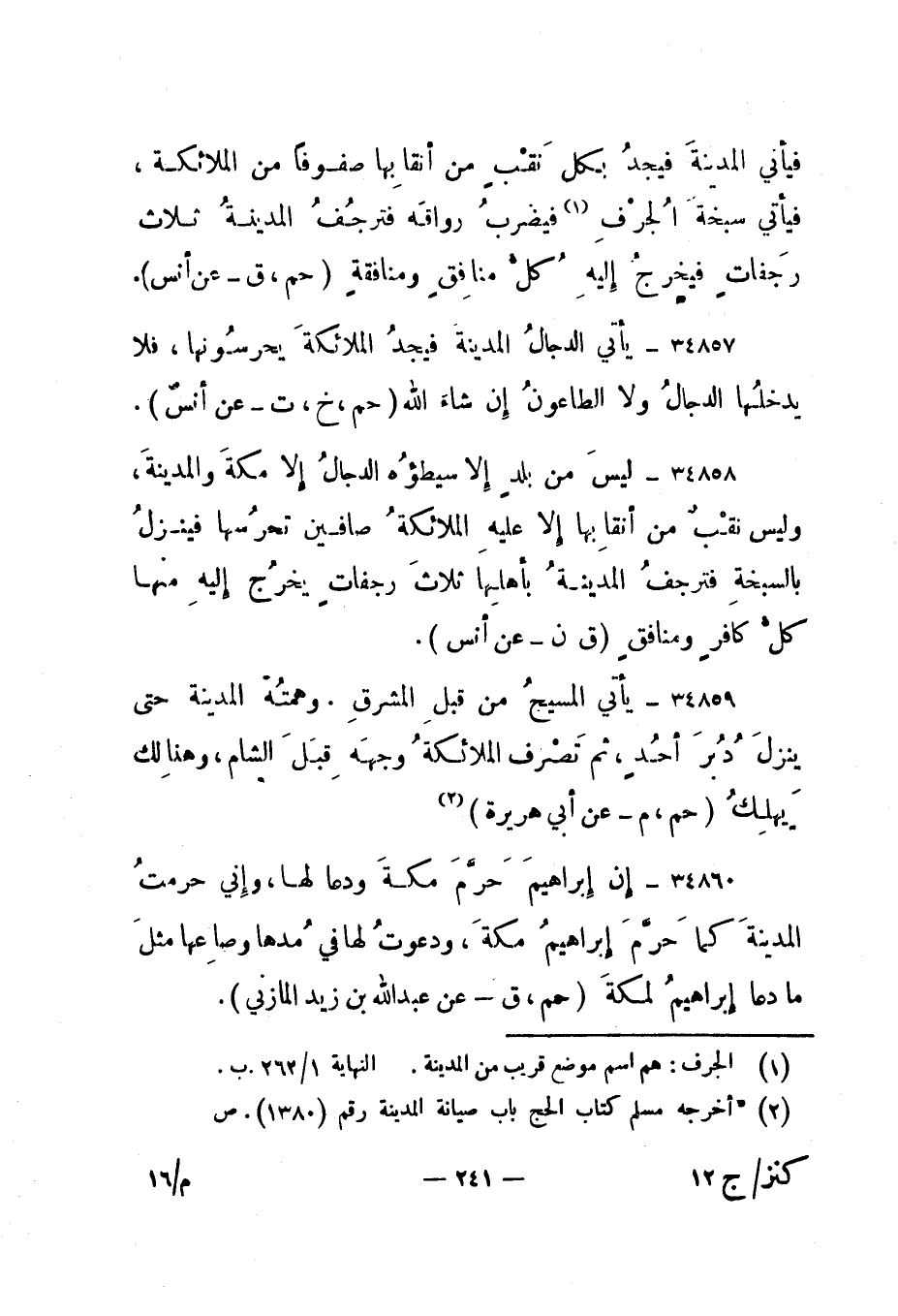 34858- " ليس من بلد إلا سيطؤه الدجال إلا مكة والمدينة، وليس نقب من أنقابها إلا عليه الملائكة صافين تحرسها فينزل بالسبخة فترجف المدينة بأهلها ثلاث رجفات يخرج إليه منها كل كافر ومنافق. " ق ن - عن أنس".