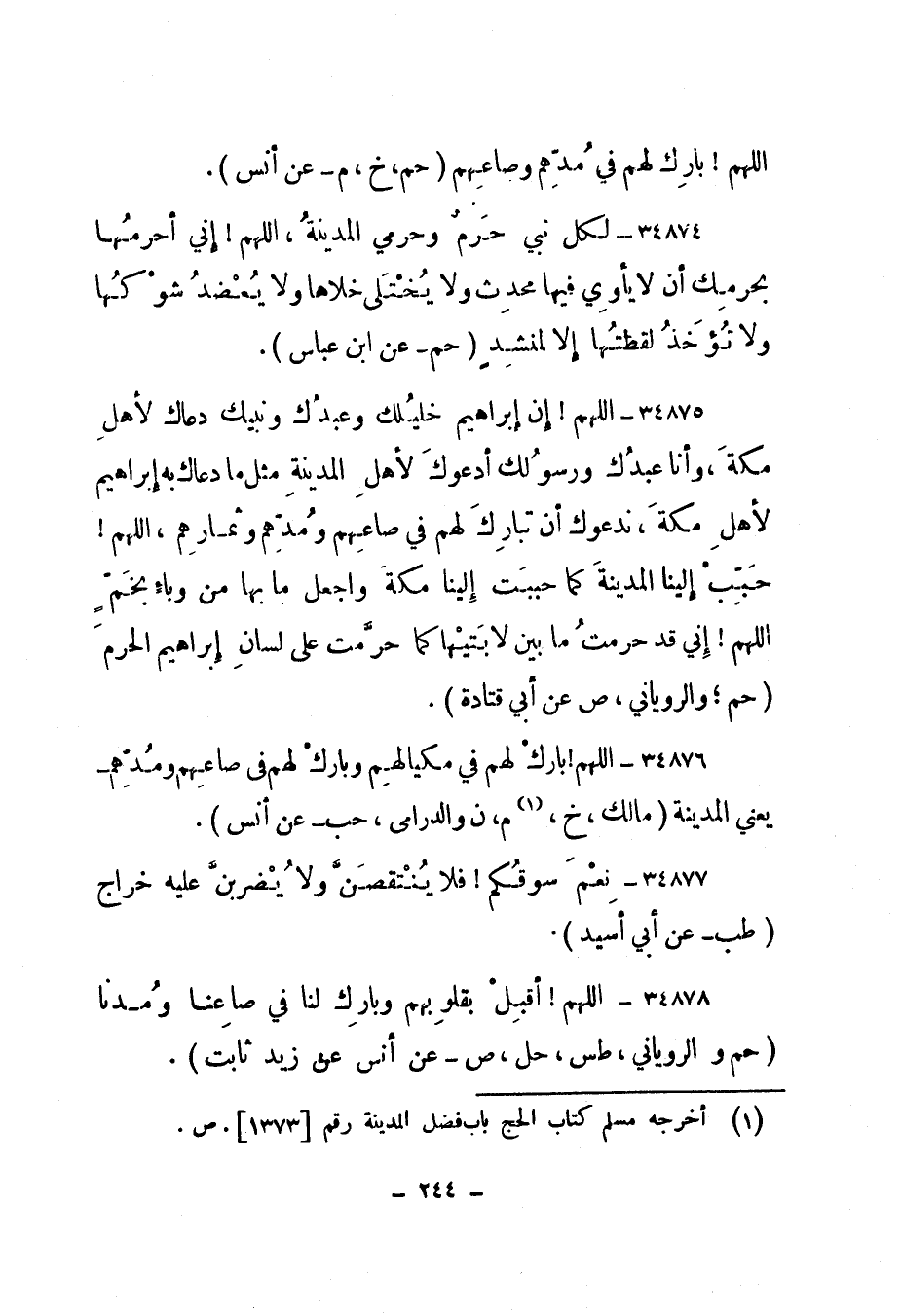 34876- " اللهم! بارك لهم في مكيالهم وبارك لهم في صاعهم ومدهم - يعني المدينة. " مالك، خ، 1 م، ن والدارمي، حب - عن أنس".
