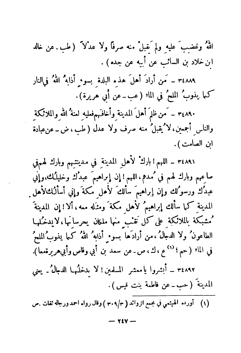 34889- " من أراد أهل هذه البلدة بسوء أذابه الله في النار كما يذوب الملح في الماء. " عب - عن أبي هريرة".