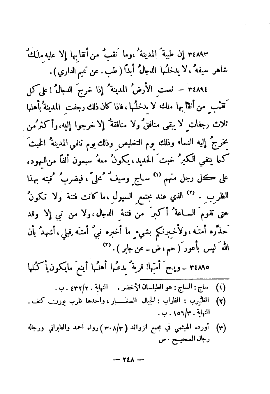 34893- " إن طيبة المدينة، وما نقب من أنقابها إلا عليه ملك شاهر سيفه، لا يدخلها الدجال أبدا. " طب - عن تميم الداري".