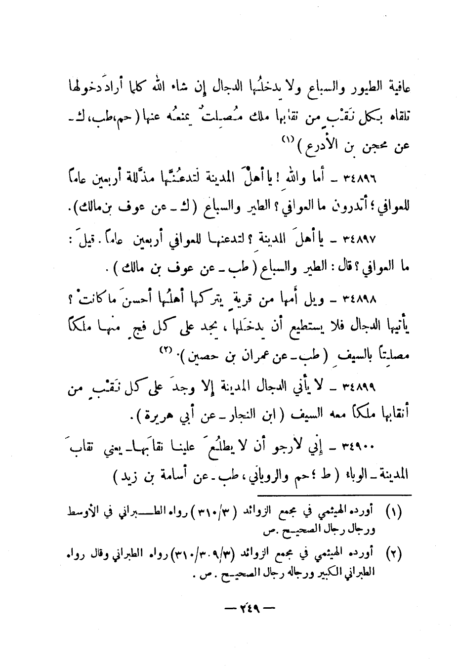 34898- " ويل أمها من قرية يتركها أهلها أحسن ما كانت؟ يأتيها الدجال فلا يستطيع أن يدخلها، يجد على كل فج منها ملكا مصلتا بالسيف. " طب - عن عمران بن حصين". 2