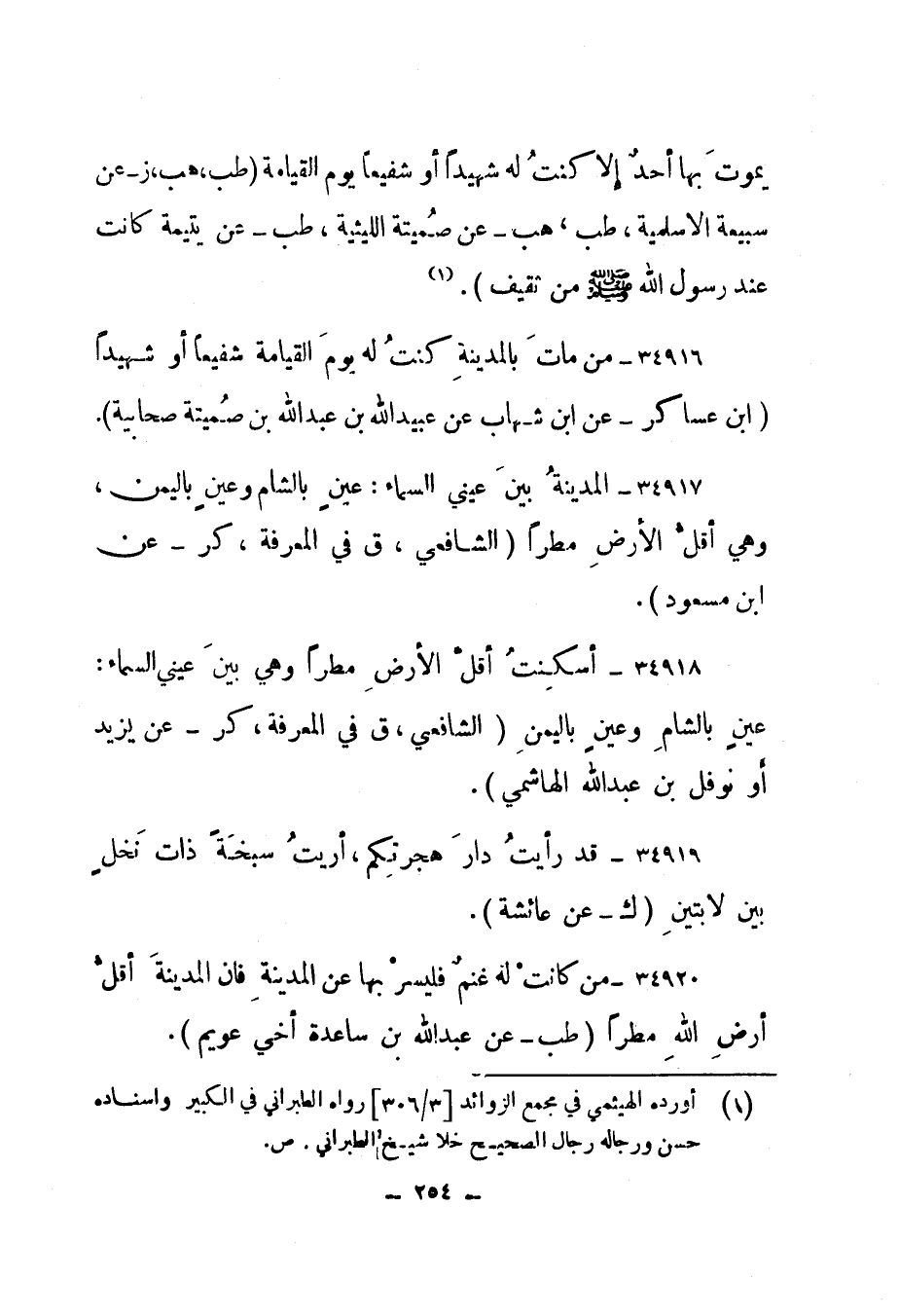 يموت بها أحد إلا كنت له شهيدا أو شفيعا يوم القيامة. " طب، هب، ز - عن سبيعة الأسلمية، طب، هب - عن صميتة اللثيثة، طب - عن يتيمة كانت عند رسول الله صلى الله عليه وسلم من ثقيف". 1