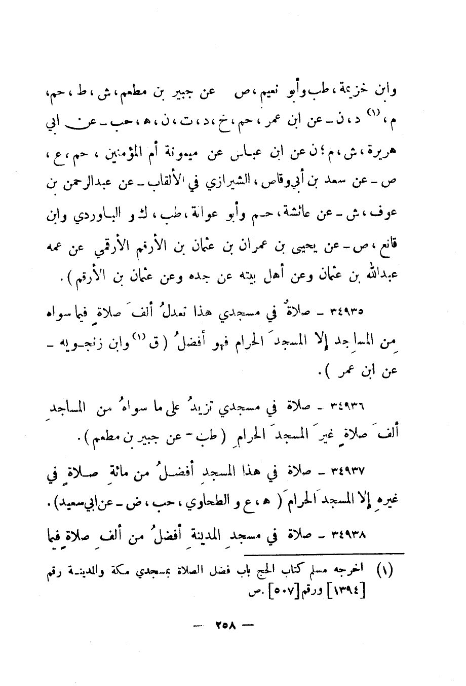34936- " صلاة في مسجدي تزيد على ما سواه من المساجد ألف صلاة غير المسجد الحرام. " طب - عن جبير بن مطعم".