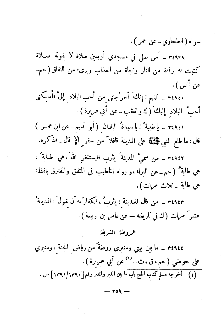34939- " من صلى في مسجدي أربعين صلاة لا يفوته صلاة كتبت له براءة من النار ونجاة من العذاب وبرئ من النفاق. " حم - عن أنس".