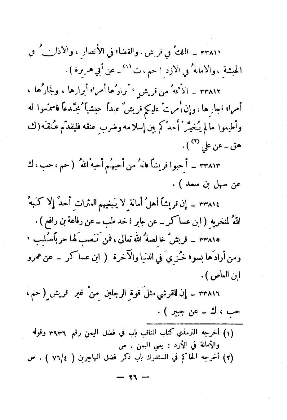 33812- "الأئمة من قريش، أبرارها أمراء أبرارها، وفجارها، أمراء فجارها، وإن أمرت عليكم قريش عبدا حبشيا مجدعا فاسمعوا له وأطيعوا ما لم يخير أحدكم بين إسلامه وضرب عنقه فليقدم عنقه. " ك، هق - عن علي 2 ".