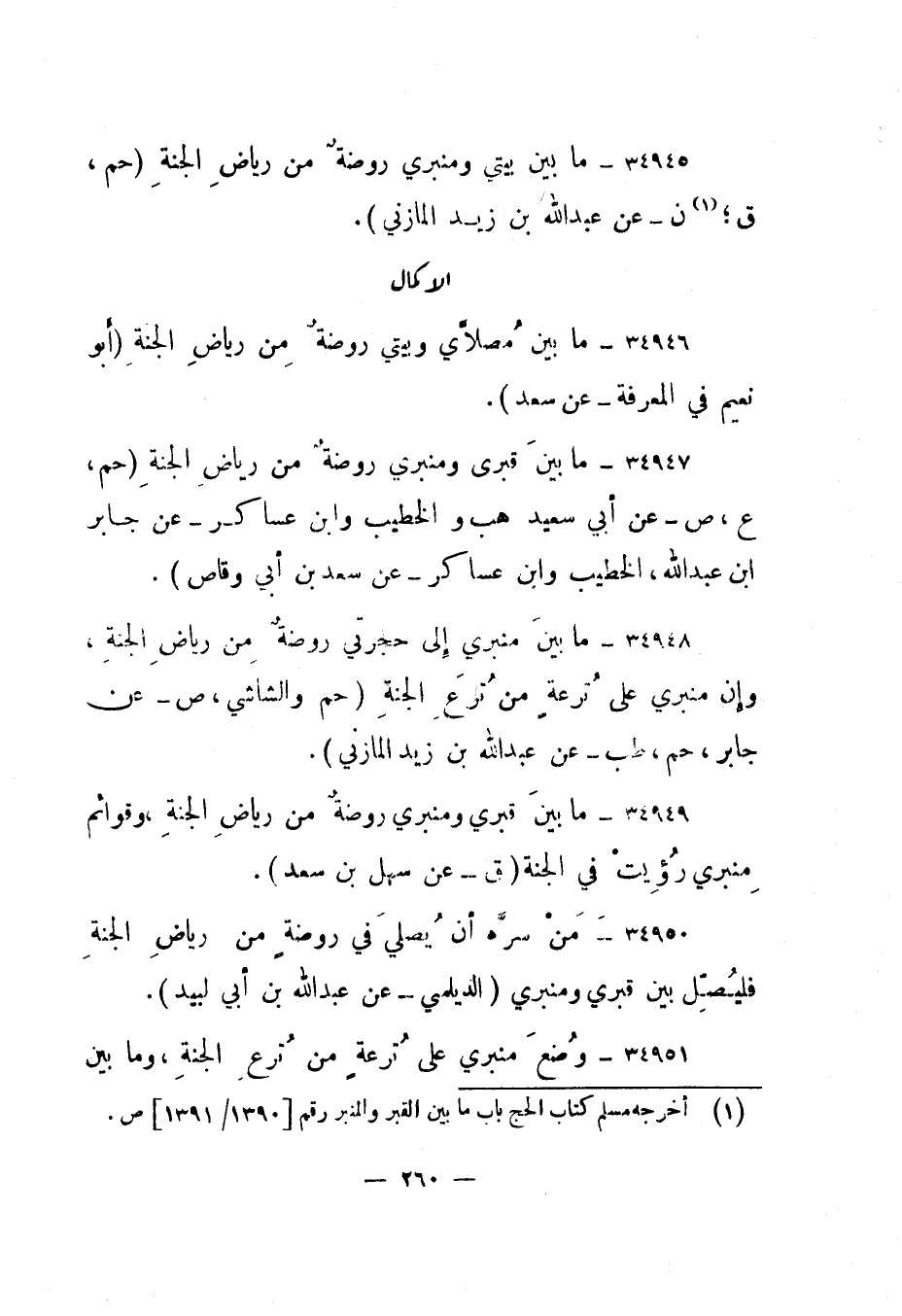34945- " ما بين بيتي ومنبري روضة من رياض الجنة. " حم، ق؛ 1 ن - عن عبد الله بن زيد المازني".