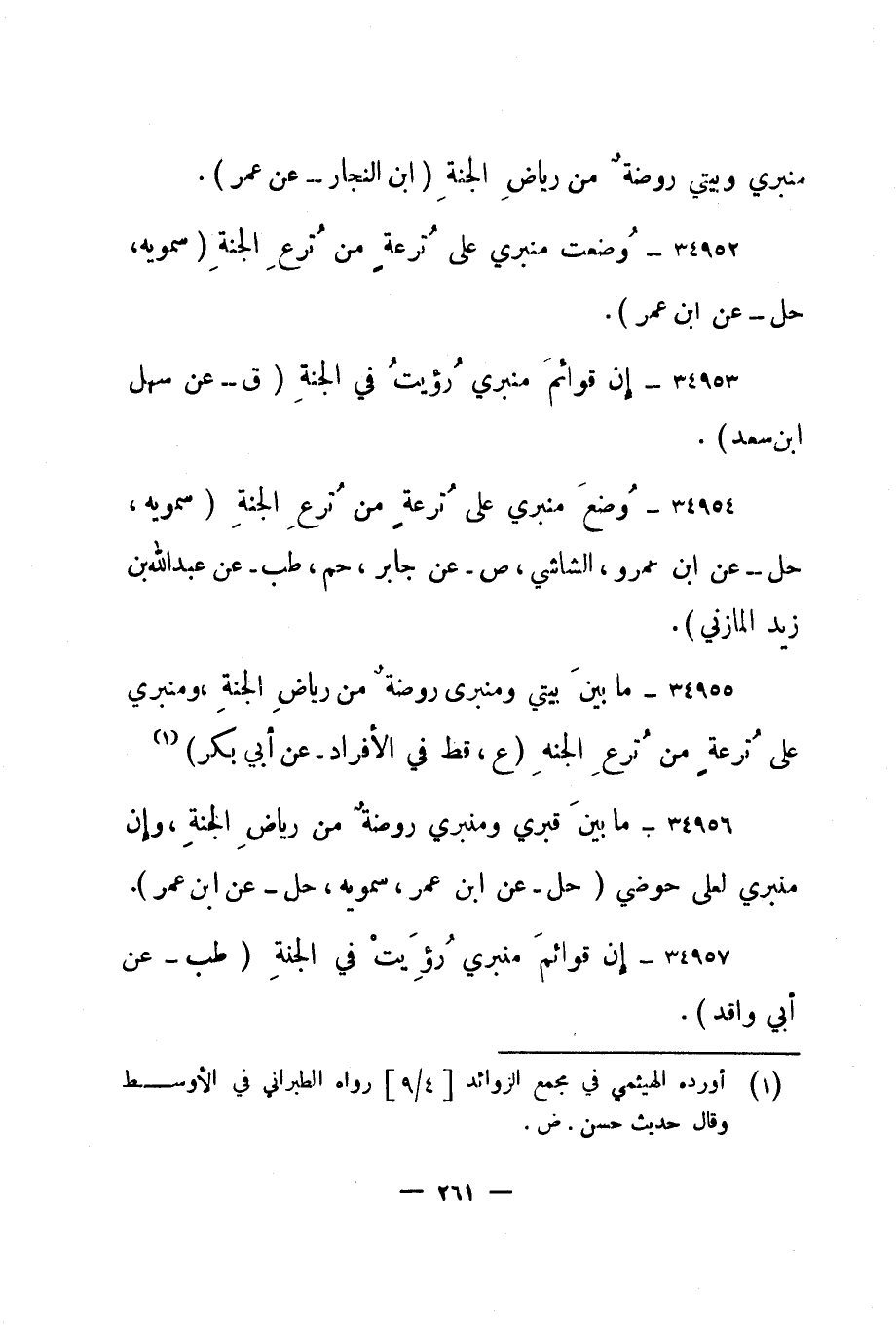 34956- " ما بين قبري ومنبري روضة من رياض الجنة، وإن منبري لعلى حوضي. " حل - عن ابن عمر، سمويه، حل - عن ابن عمر".