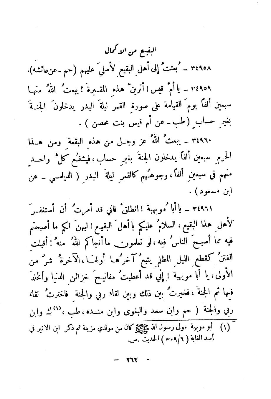 34959- " يا أم قيس! أترين هذه المقبرة؟ يبعث الله منها سبعين ألفا يوم القيامة على صورة القمر ليلة البدر يدخلون الجنة بغير حساب. " طب - عن أم قيس بنت محصن".