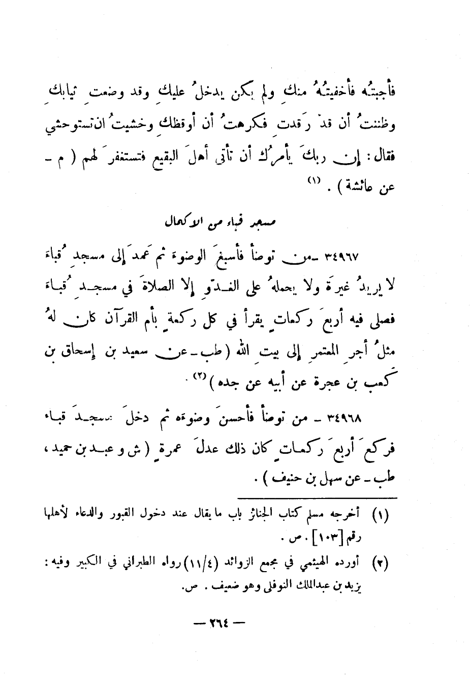 34968- " من توضأ فأحسن وضوءه ثم دخل مسجد قباء فركع أربع ركعات كان ذلك عدل عمرة. " ش وعبد بن حميد، طب - عن سهل بن حنيف".