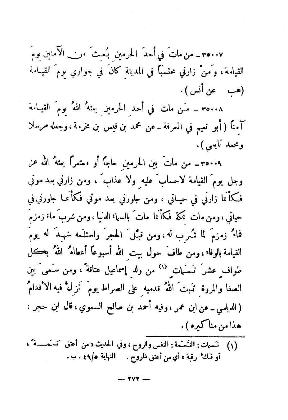 35008- " من مات في أحد الحرمين بعثه الله يوم القيامة آمنا. " أبو نعيم في المعرفة - عن محمد بن قيس بن مخرمة، وجعله مرسلا ومحمد تابعي".