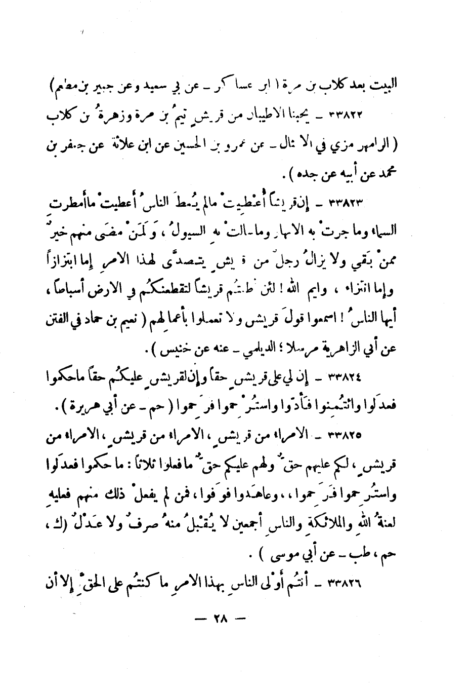 33824- "إن لي على قريش حقا وإن لقريش عليكم حقا ما حكموا فعدلوا وائتمنوا فأدوا واسترحموا فرحموا. " حم - عن أبي هريرة".