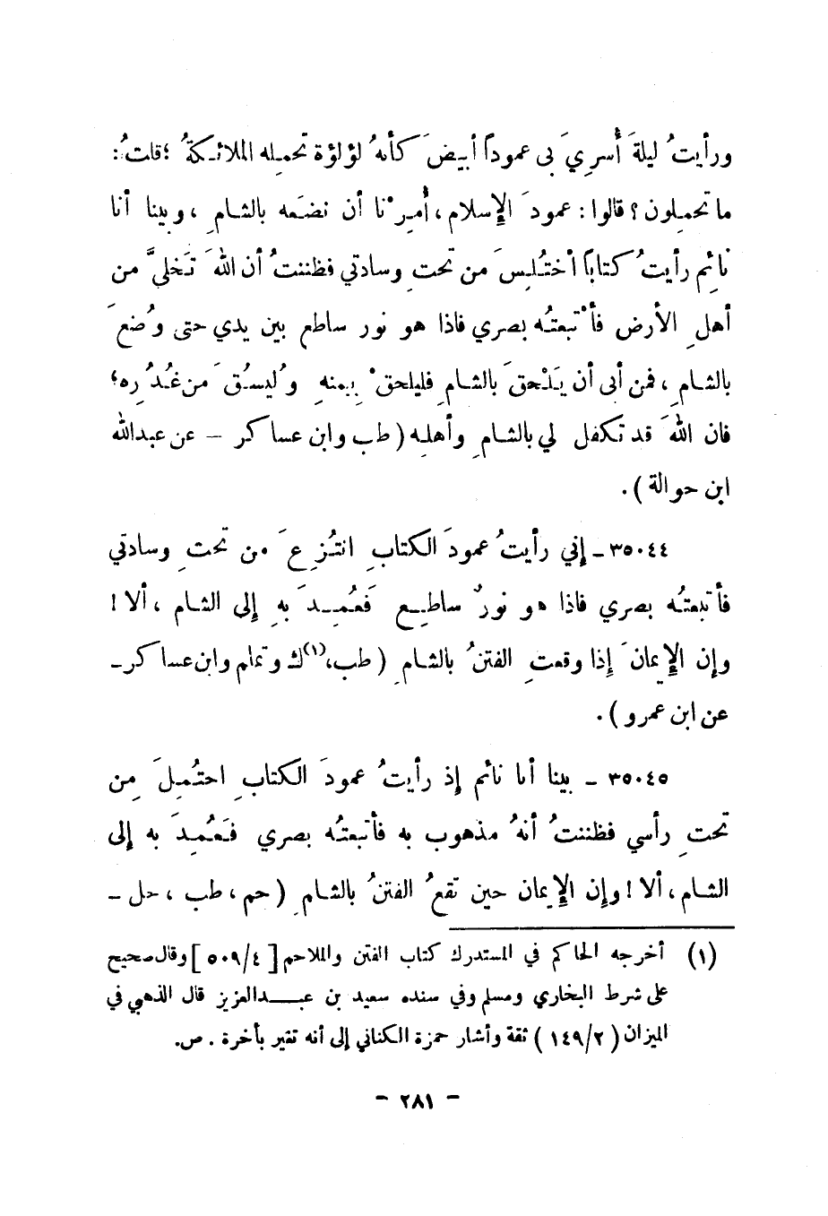 35045- "بينا أنا نائم إذ رأيت عمود الكتاب احتمل من تحت رأسي فظننت أنه مذهوب به فأتبعته بصري فعمد به إلى الشام، ألا! وإن الإيمان حين تقع الفتن بالشام. " حم، طب، حل -