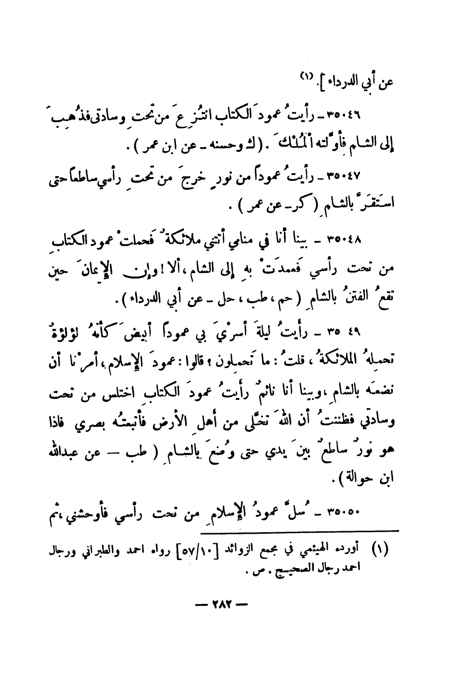 35046- "رأيت عمود الكتاب انتزع من تحت وسادتي فذهب إلى الشام فأولته الملك. " ك وحسنه - عن ابن عمر".