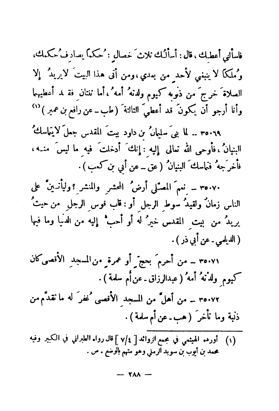 35071- " من أحرم بحج أو عمرة من المسجد الأقصى كان كيوم ولدته أمه. " عبد الرزاق - عن أم سلمة".