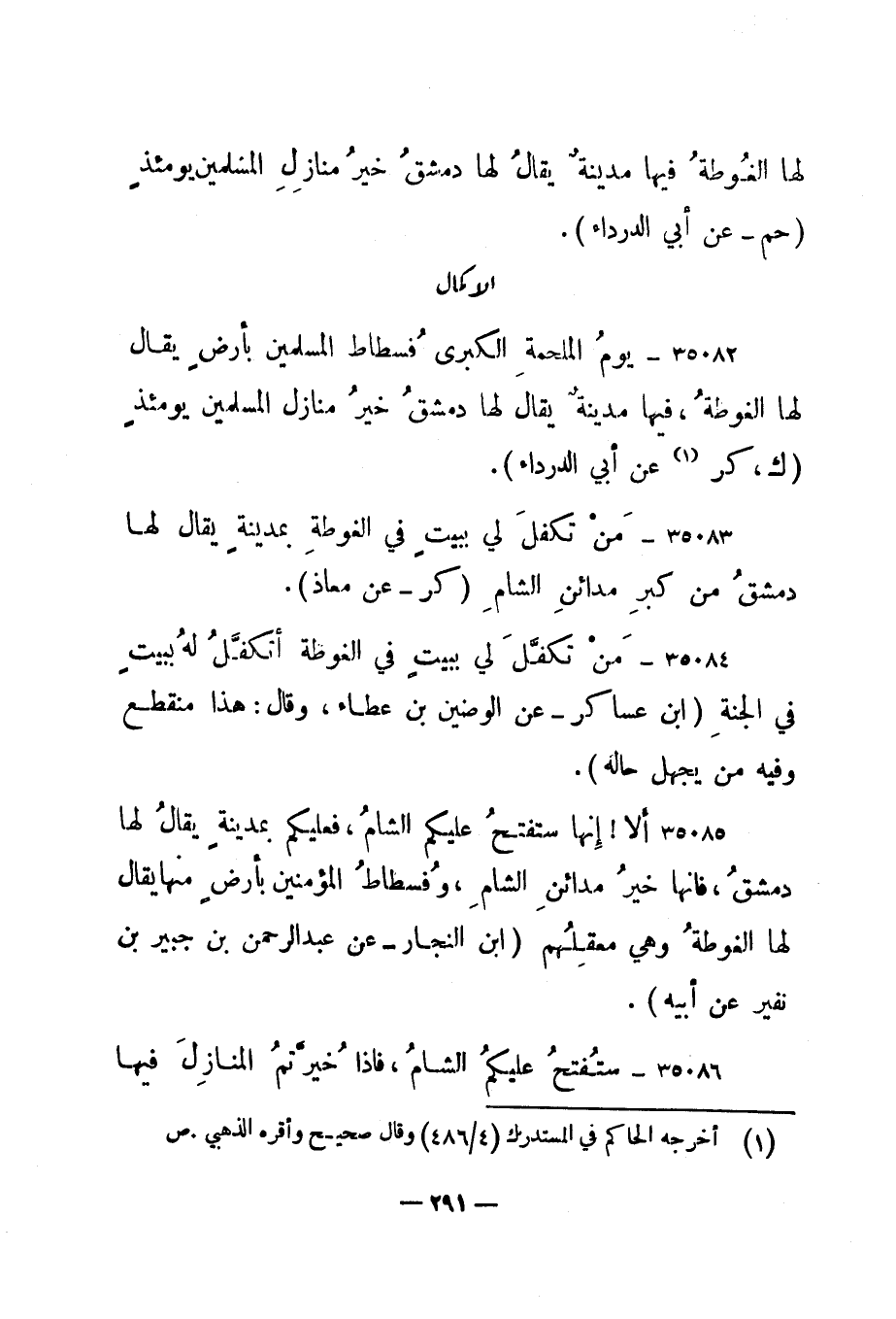 35082- "يوم الملحمة الكبرى فسطاط المسلمين بأرض يقال لها الغوطة، فيها مدينة يقال لها دمشق خير منازل المسلمين يومئذ. " ك، كر 1 عن أبي الدرداء".