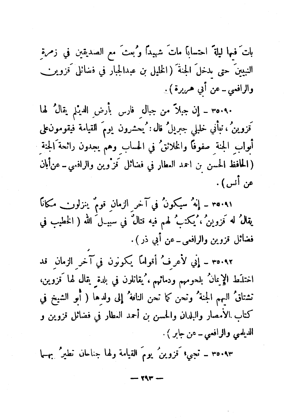 35092- " إني لأعرف أقواما يكونون في آخر الزمان قد اختلط الإيمان بلحومهم ودمائهم، يقاتلون في بلدة يقال لها قزوين، تشتاق إليهم الجنة وتحن كما تحن الناقة إلى ولدها. " أبو الشيخ في كتاب الأمصار والبلدان والحسن بن أحمد العطار في فضائل قزوين والديلمي والرافعي - عن جابر".