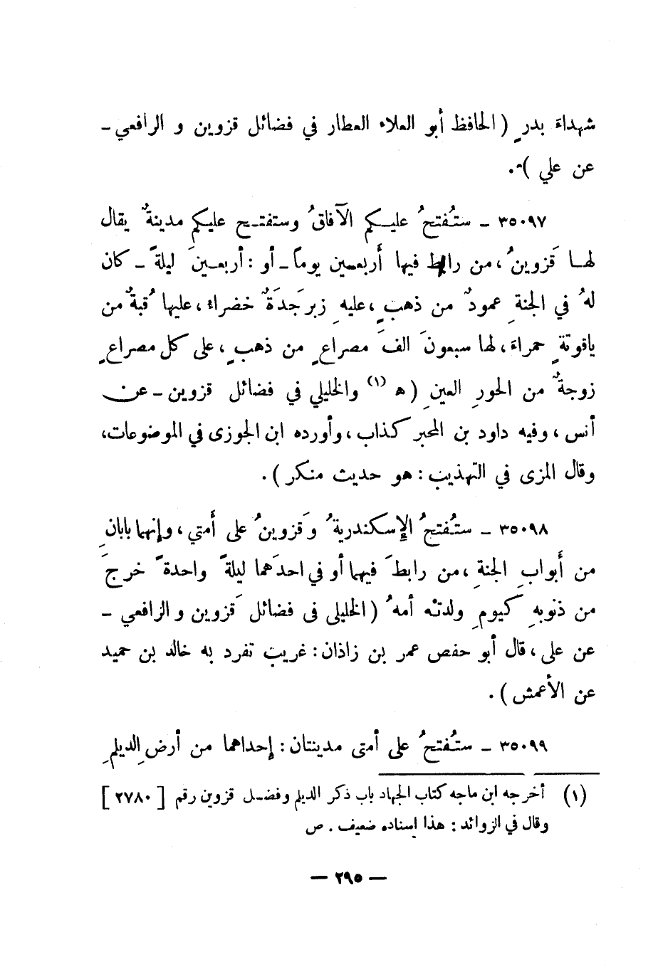 35098- "ستفتح الإسكندرية وقزوين على أمتي، وإنهما بابان من أبواب الجنة، من رابط فيهما أو في احداهما ليلة واحدة خرج من ذنوبه كيوم ولدته أمه. " الخليلي في فضائل قزوين والرافعي - عن علي، قال أبو حفص عمر بن زاذان: غريب تفرد به خالد بن حميد عن الأعمش".