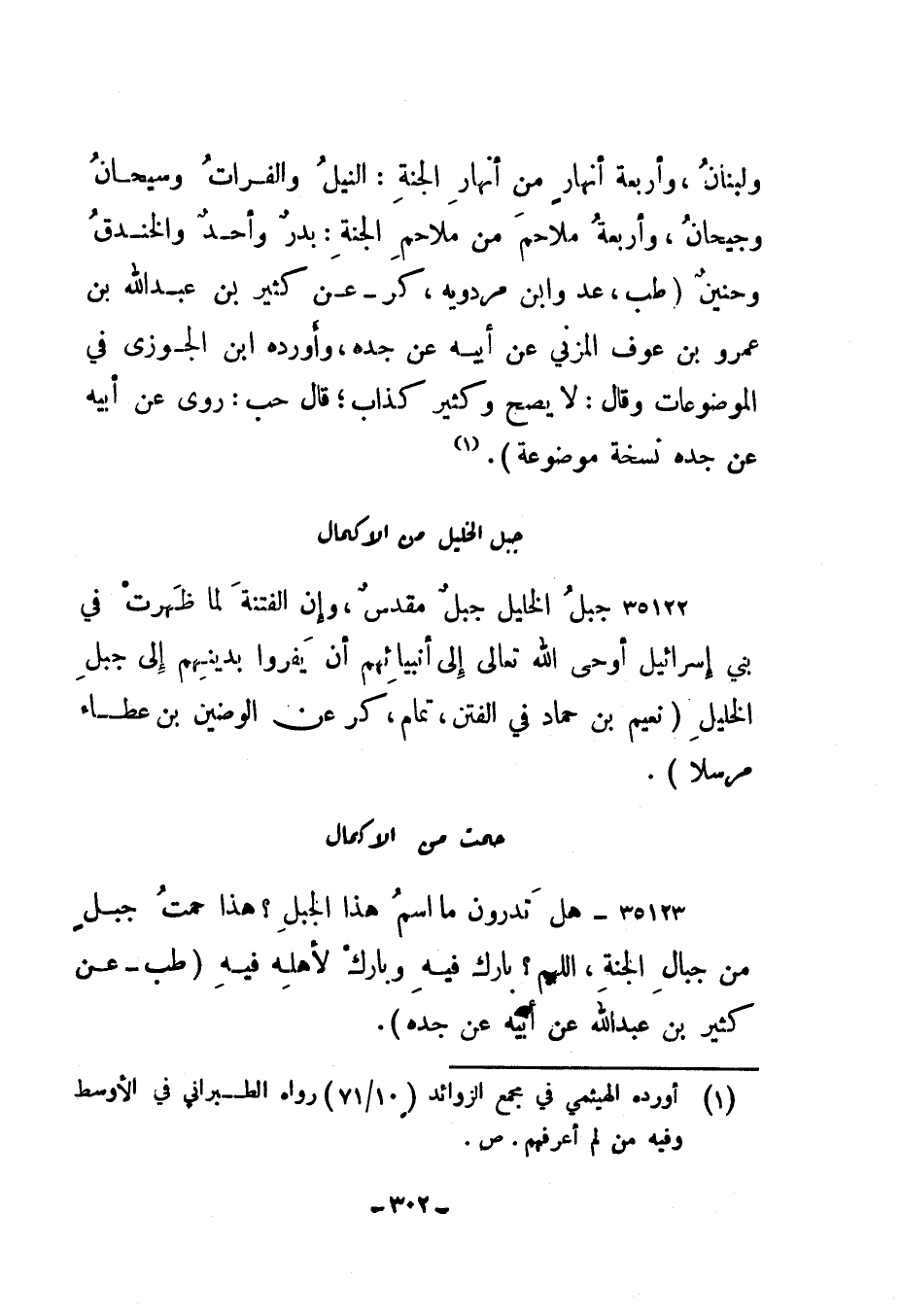 35122- " جبل الخليل جبل مقدس، وإن الفتنة لما ظهرت في بني إسرائيل أوحى الله تعالى إلى أنبيائهم أن يفروا بدينهم إلى جبل الخليل. " نعيم بن حماد في الفتن، تمام، كر عن الوضين بن عطاء مرسلا".