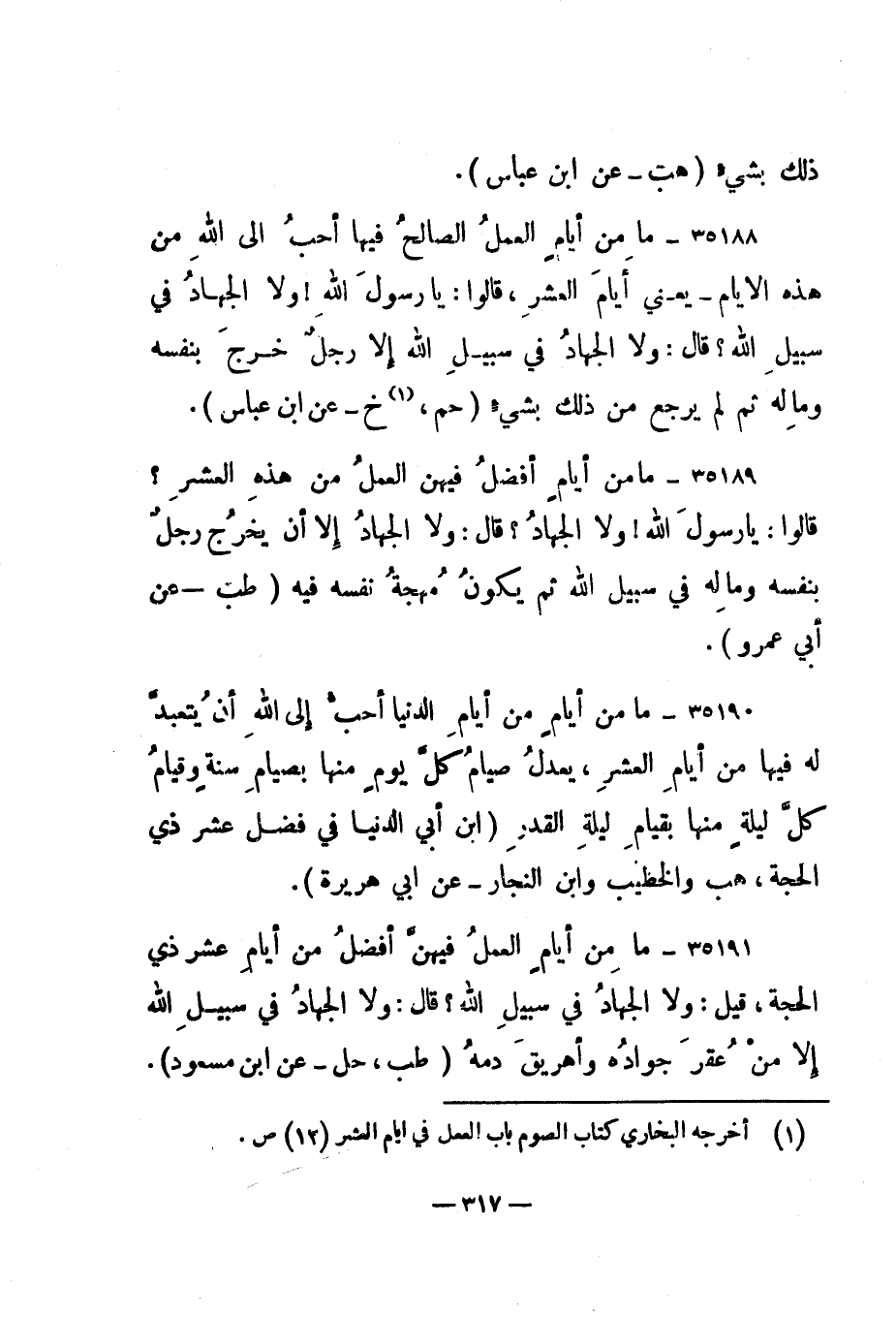 35188- "ما من أيام العمل الصالح فيها أحب إلى الله من هذه الأيام - يعني أيام العشر، قالوا: يا رسول الله! ولا الجهاد في سبيل الله؟ قال: ولا الجهاد في سبيل الله إلا رجل خرج بنفسه وماله ثم لم يرجع من ذلك بشيء. " حم، 1 خ - عن ابن عباس".