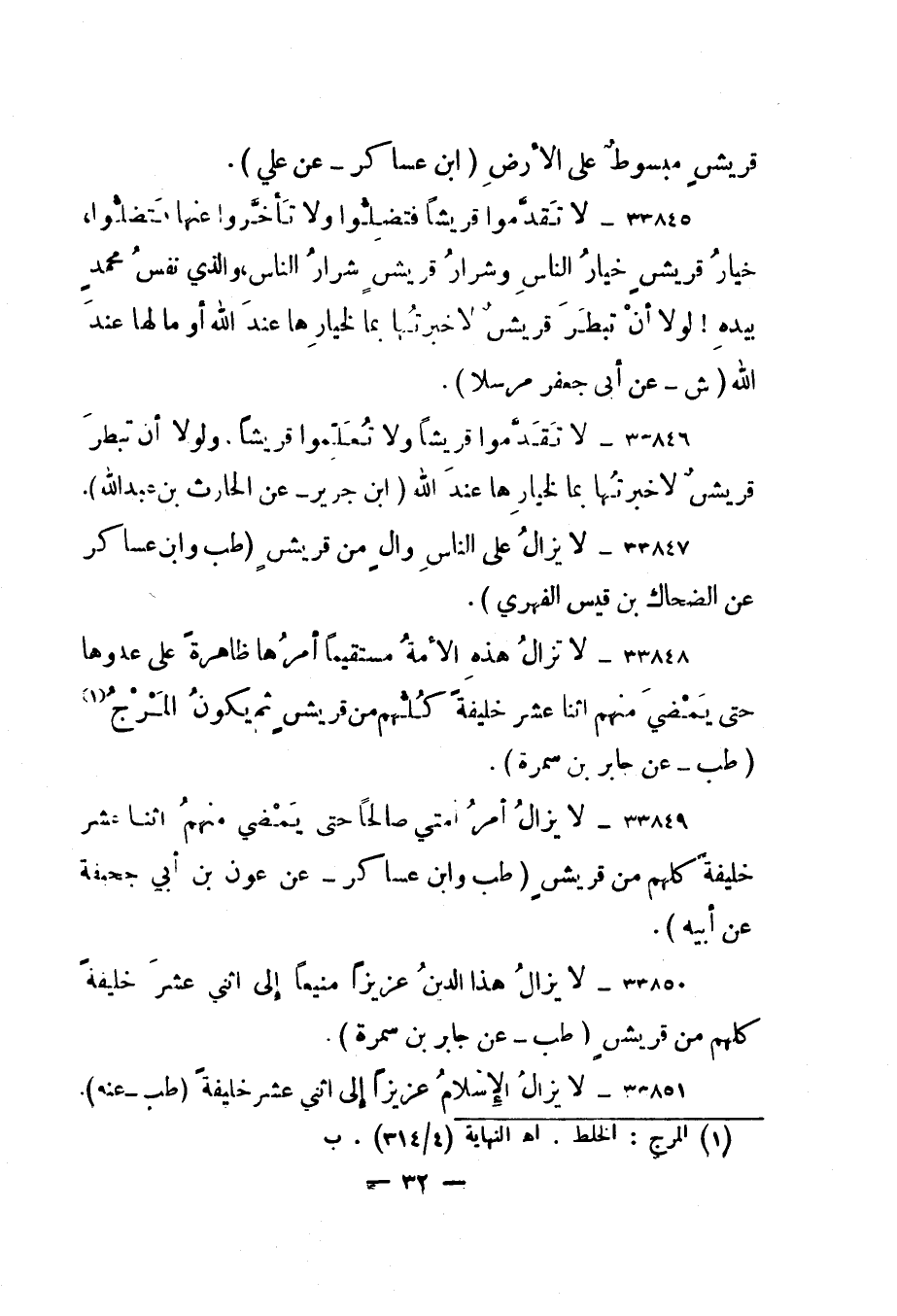 33848- "لا تزال هذه الأمة مستقيما أمرها ظاهرة على عدوها حتى يمضي منهم اثنا عشر خليفة كلهم من قريش ثم يكون المرج 1. " طب - عن جابر بن سمرة".