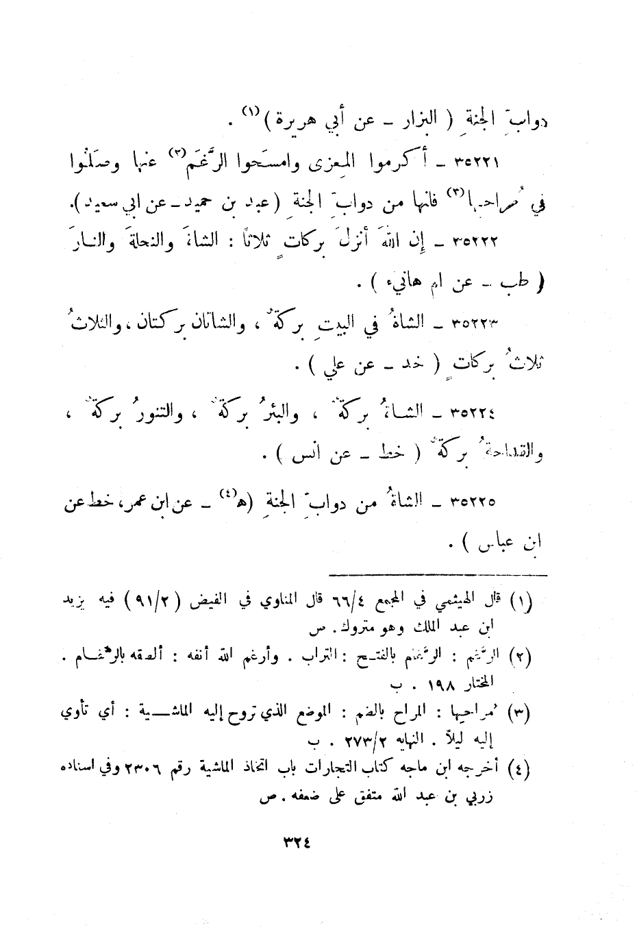 35221- " أكرموا المعزى وامسحوا الرغم 2 عنها وصلوا في مراحها 3 فإنها من دواب الجنة. " عبد بن حميد - عن أبي سعيد".