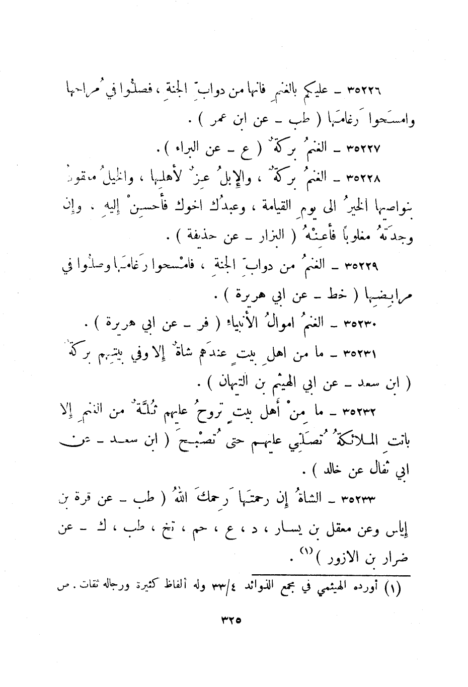 35232- " ما من أهل بيت تروح عليهم ثلة من الغنم إلا باتت الملائكة تصلي عليهم حتى تصبح. " ابن سعد - عن أبي ثفال عن خالد".