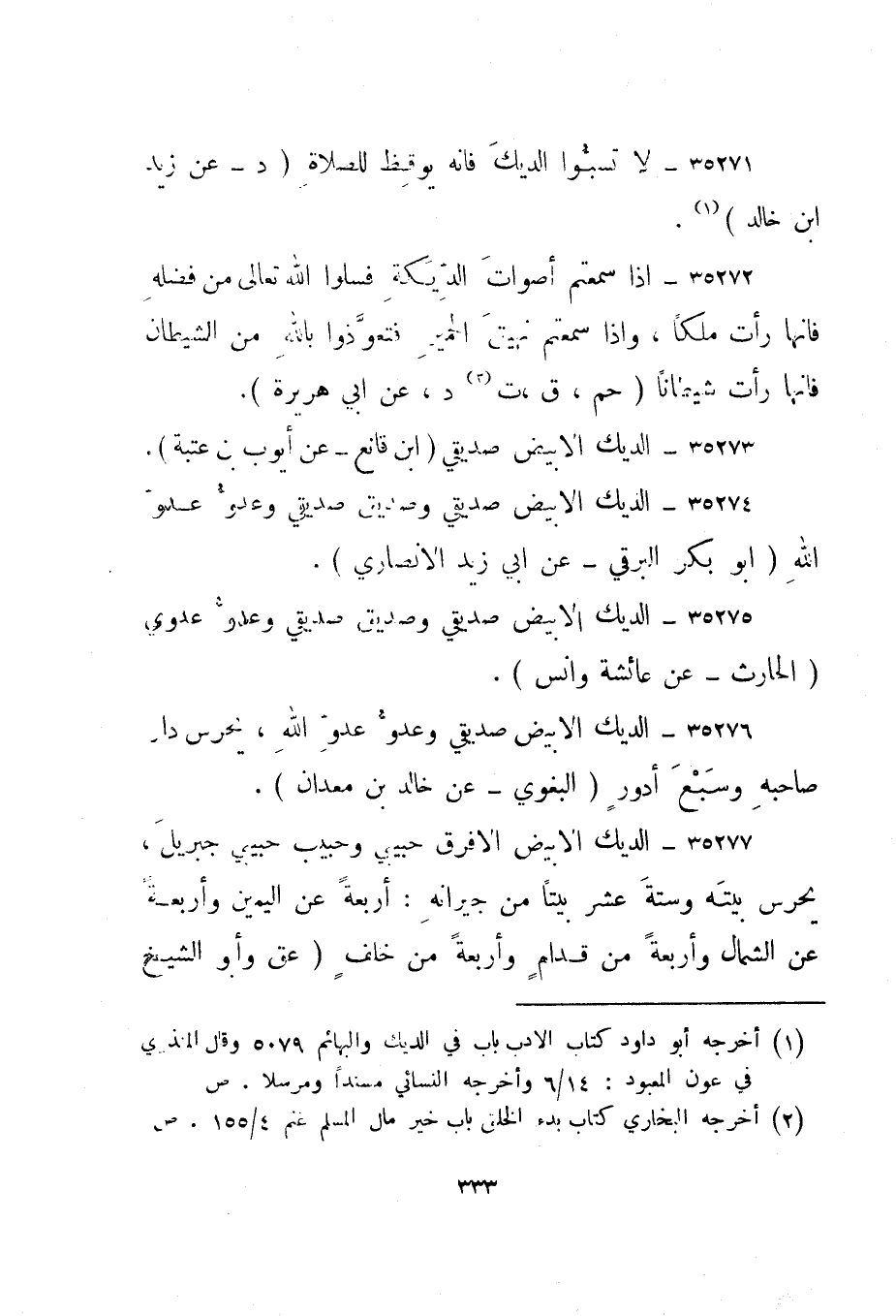 35276- " الديك الأبيض صديقي وعدو عدو الله، يحرس دار صاحبه وسبع أدور. " البغوي - عن خالد بن معدان".