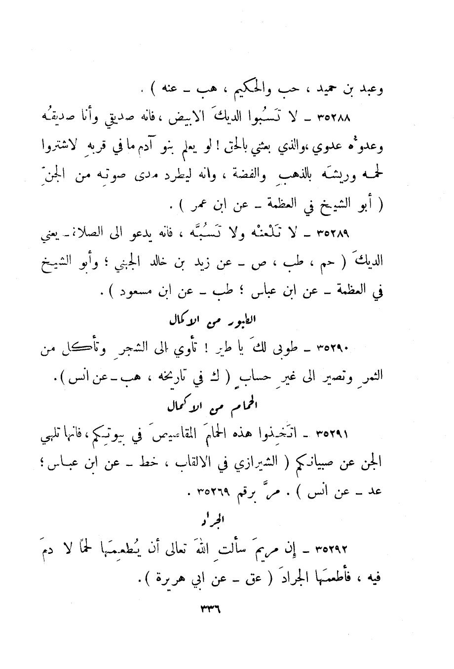 35288- "لا تسبوا الديك الأبيض، فإنه صديقي وأنا صديقه وعدوه عدوي، والذي بعثني بالحق! لو يعلم بنو آدم ما في قربه لاشتروا لحمه وريشه بالذهب والفضة، وإنه ليطرد مدى صوته من الجن." أبو الشيخ في العظمة - عن ابن عمر".